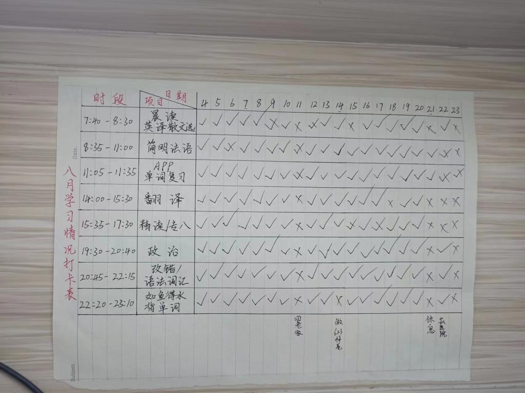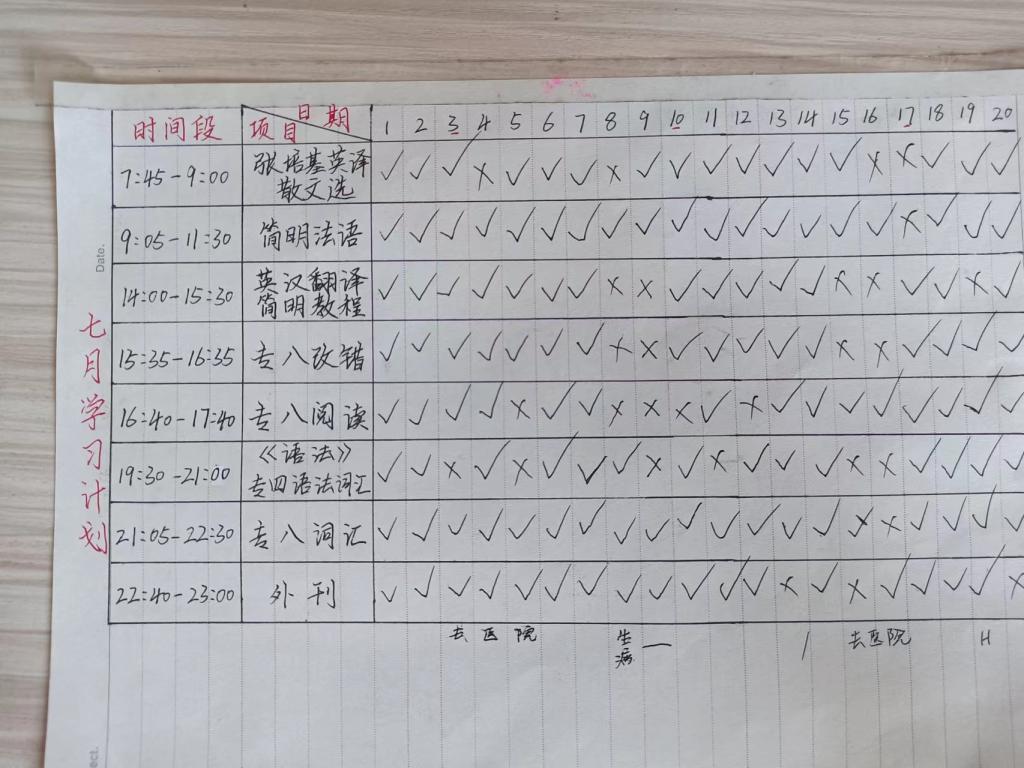 回顾我整个备考历程,大大小小的困难和坎坷不胜枚举。其中有两个时期是比较煎熬的。暑假期间,父亲生病,我一边照顾父亲一边备考,去医院的路上听英语听力,在父亲的病床边背单词或看学习视频,期间自己也得了场病,连续打了六天的点滴,也是一手插着针管,一手拿手机背单词。10月,受疫情影响,学校静态管理,我调整原有的计划,充分利用现有的复习资料以及班主任Rena在网上给我找来许多广外的备考资料,在宿舍楼自习室、楼道、宿舍继续复习,我知道绝对不能让复习中断或受到过多的影响。当时我并不觉得这些算得上什么大困难,因为我本来心态就比较稳,几年的自律生活也极大的锻炼了我的抗压能力,除了复习也没其他念想。所以,我当时就把这些小插曲当作生活对我的考验、是求学之路对我意志的测试,我的战斗欲也成功地被燃起。