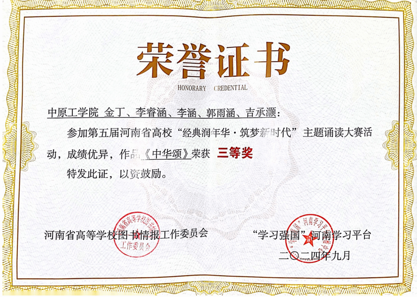 近日,第五届河南省高校“经典润年华·筑梦新时代”主题诵读大赛结果出炉,万象城官网汉语国际教育专业金丁、李睿涵、李涵、郭雨涵、吉承灏录制的朗诵作品《中华颂》荣获本科生组三等奖。
