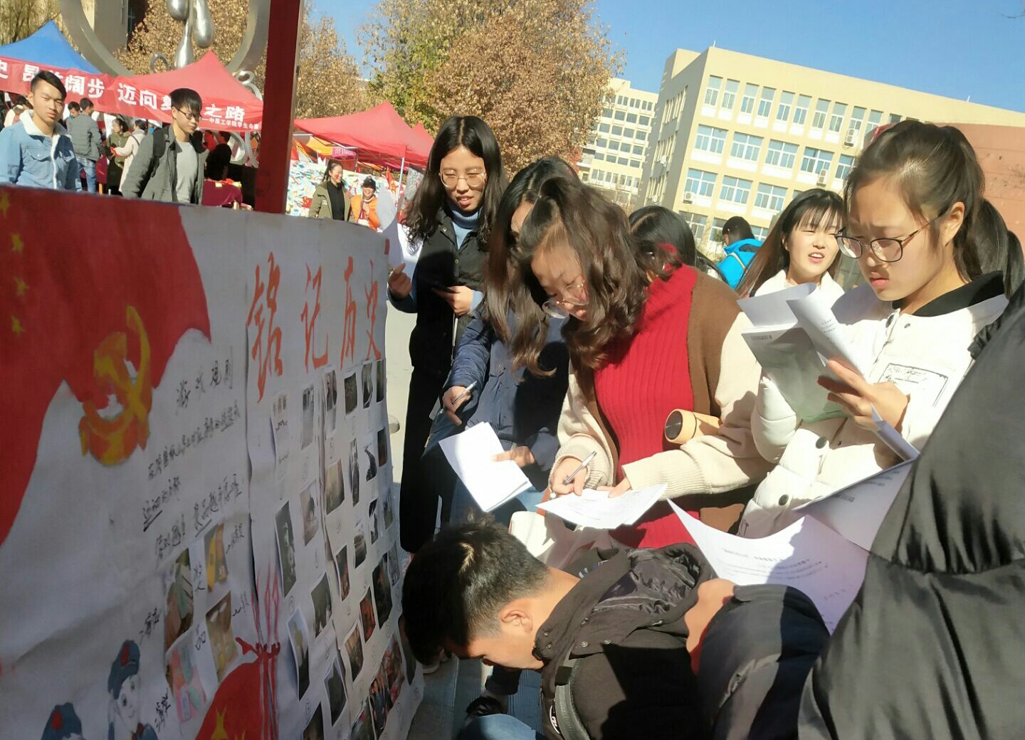 活动中,两个班的同学分别进行了历史事件有奖竞猜和爱国寄语等环节。伴随着激情洋溢的音乐,路过的学生纷纷前来围观,积极参与到活动中,现场气氛热烈,两班同学合作默契,分工明确,活动顺利进行。下午两点,全体同学合影留念,活动圆满结束。
