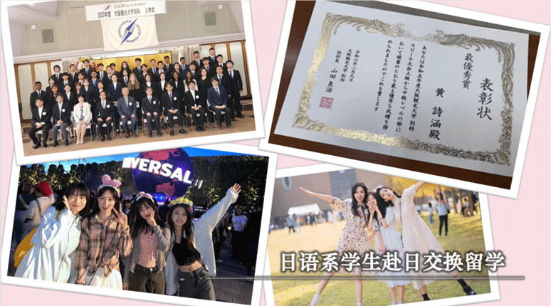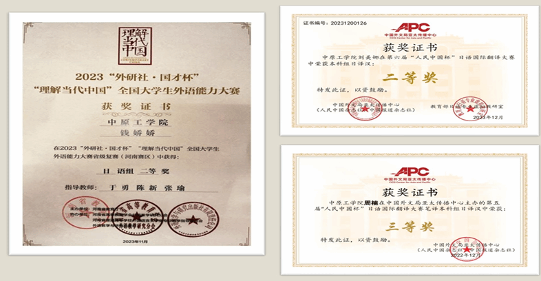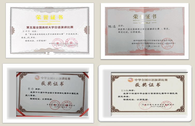 获奖情况:本专业坚持实践育人、坚守服务社会的价值导向,培养学生具备科学思维、创新意识、合作精神等更全面的能力和素质。近3年来,获全国大学生日语演讲比赛一等奖1项,二等奖1项,河南省大学生日语演讲比赛一等奖2项,二等奖4项,人民中国杯日语国际翻译大赛二等奖1项,三等奖1项。“外研社·国才杯”“理解当代中国”全国大学生外语能力大赛多语种组日语比赛二等奖1项,优胜奖1项。
