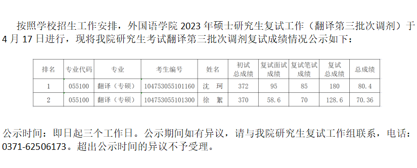 万象城allwincity官网2023年研究生第三批次调剂复试名单公示(翻译)