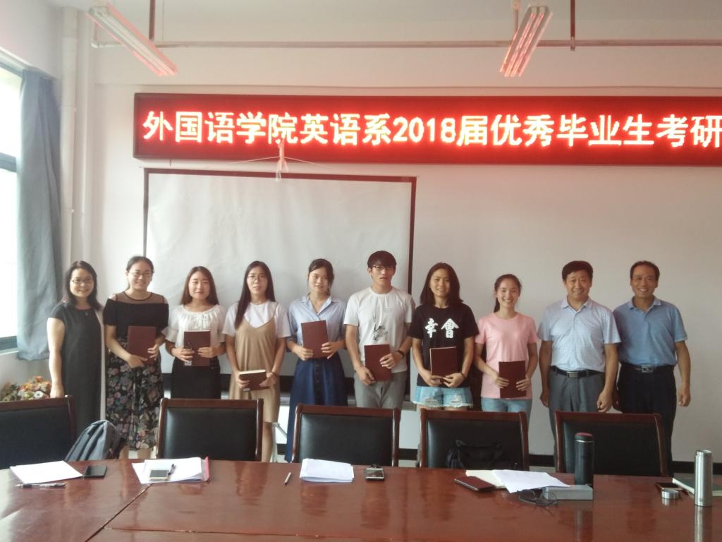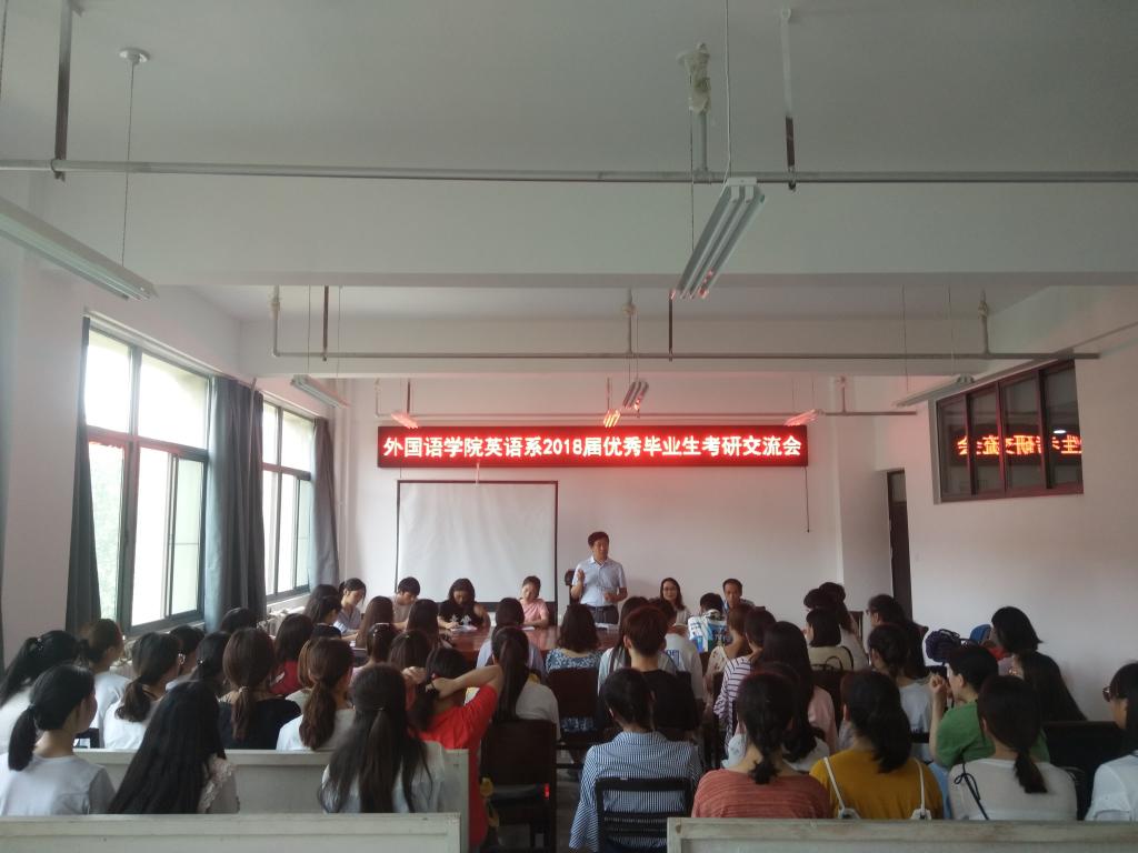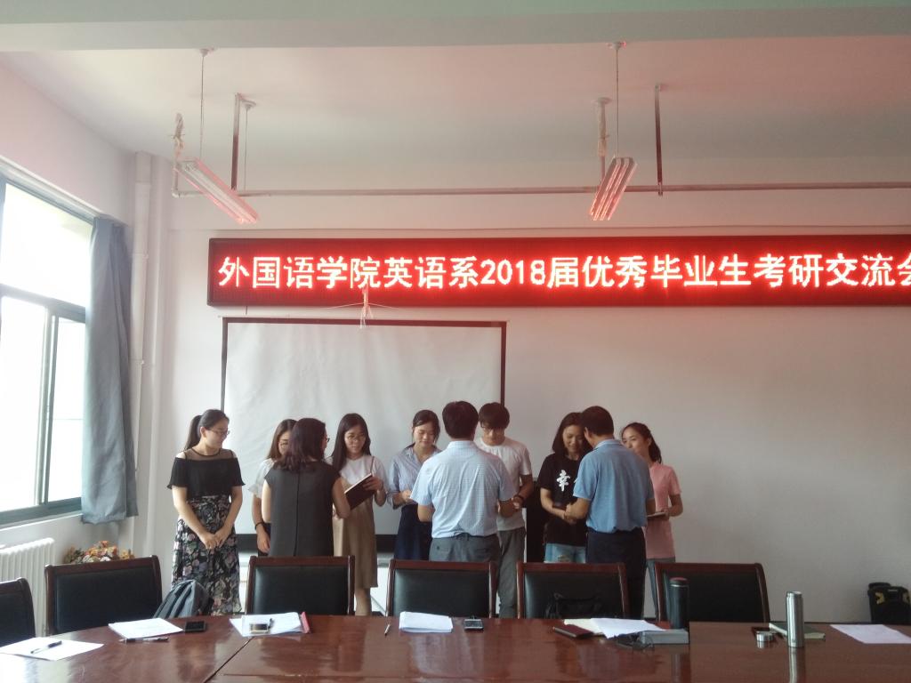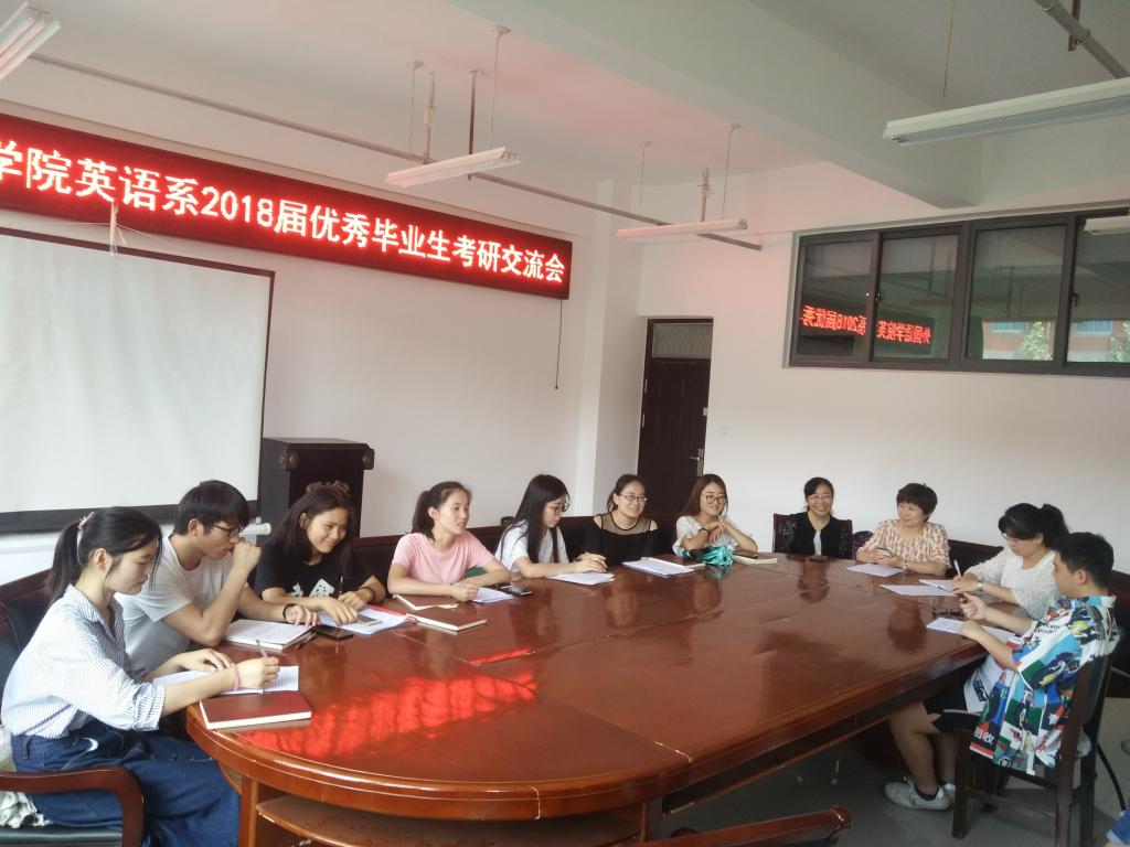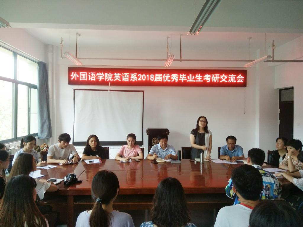 为了进一步提高万象城官网学生的考研热情,明确考研目标,掌握相关考研技巧,了解更多考研信息,万象城官网于2018年6月15日中午12点45分在三号组团楼402教室举办了万象城allwincity官网英语系2018届优秀毕业生考研交流会。出席本次交流会领导老师有万象城allwincity官网院长郭万群、党总支书记姚晓鸣、党总支副书记周全营、英语系系主任郝玉娟、英语系副主任刘丽、英语系教师代表郭亭亭以及在今年成功考研的七位优秀毕业生,他们分别是:熊小红、耿志梅、赵真霞、赵美月、顾晓雨、张士鑫、朱思晴。