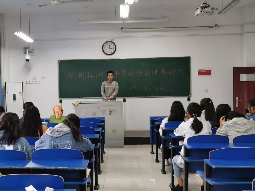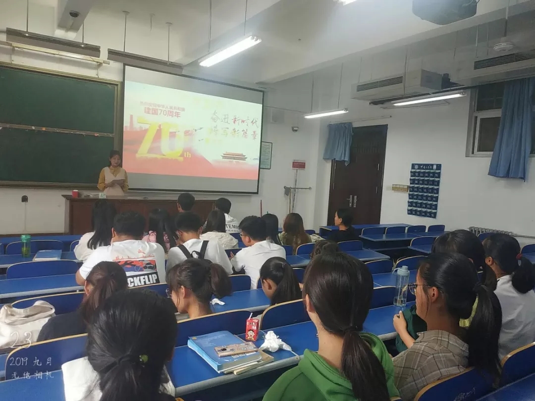 我们的活动主体以班会的形式进行。在班长的带领下,我们了解了孔繁森、王继才夫妇、其美多吉等优秀先进人物。他们都是凝聚中国精神、中国力量的体现。我们倍受鼓舞,也在心中埋下一个希望与力量的种子。在会议期间,同学们就祖国70年的历史进程展开了热烈的讨论,大家都讲起了心中的英雄,也为这次活动更添了一份激情。之后陈若飞同学的发言也是讲出了大家的心声,一时掌声频起。今天也留下了我们班级的第一次大合照,大家脸上的笑容不再似初见是的腼腆,有的都是发自内心的欢欣以及对祖国日益强大的自信。