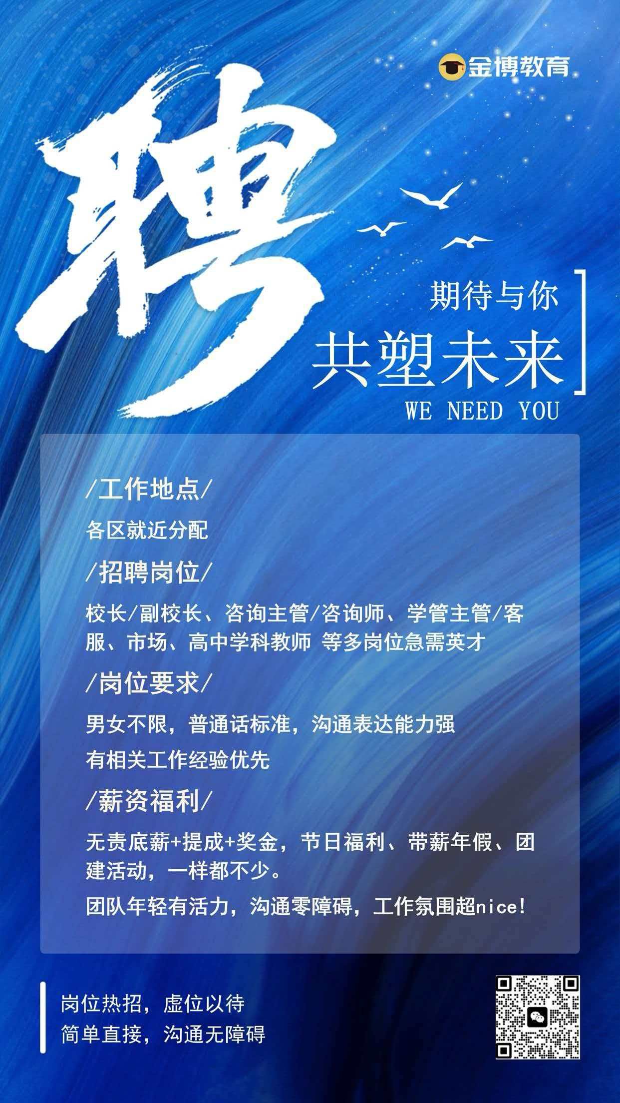 金博教育,全国知名教育头部品牌。16年专注k12一对一个性化、中高考全托文化课辅导。金博教育成立于2009年,总部在北京。全国200余家直营校区。2016年北京总部已新三板上市 股票代码:667674。河南大区十城市40余家直营门店。面试通过后将就近安排河南各校区。(目前河南大区覆盖分布城市:郑州、洛阳、开封、安阳、新乡、许昌、平顶山、鹤壁、漯河、滑县)